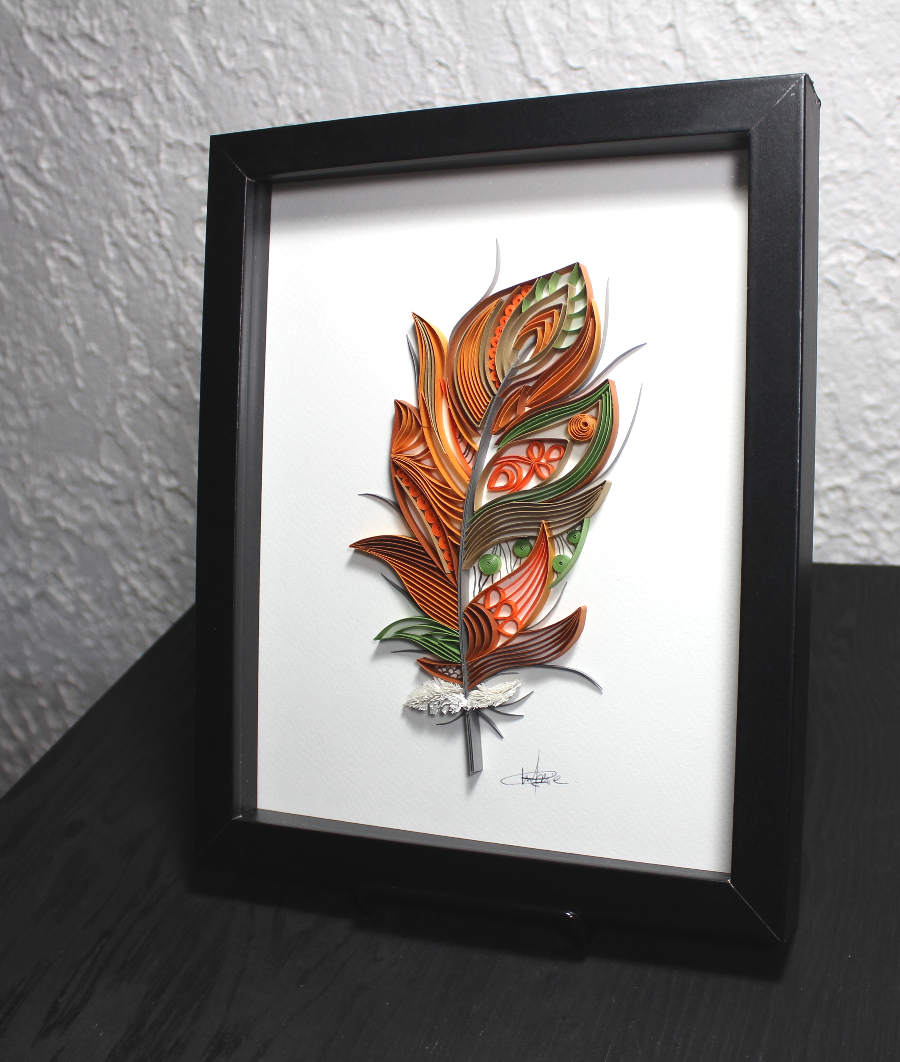 Au tournant du millénaire, je découvre la technique ancestrale du quilling. Autodidacte, j'explore des motifs floraux, de fine dentelle, d’oiseaux colorés que je peux faire jaillir de la toile en plusieurs dimensions.